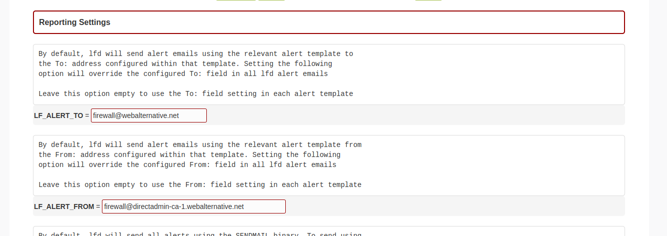 - Ajouter votre adresse e-mail (ex: firewall@mon-domaine.xxx) dans la variable LF_ALERT_TO =